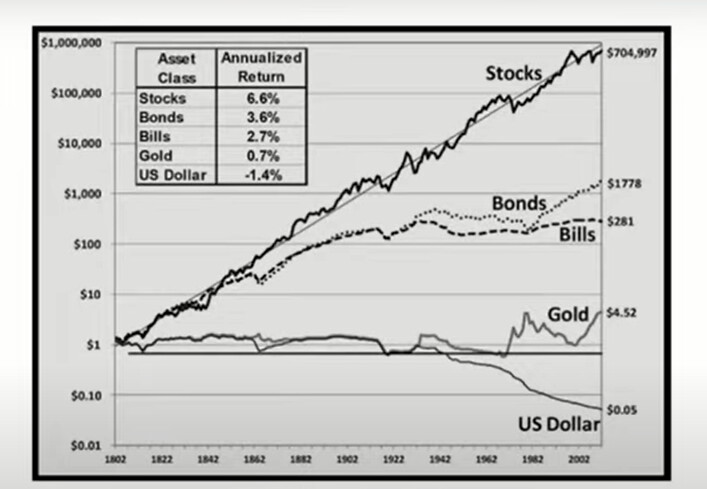 A todos nos gusta por ejemplo extrapolar la rentabilidad histórica de las acciones USA a más de 200 años como muestra el habitual gráfico