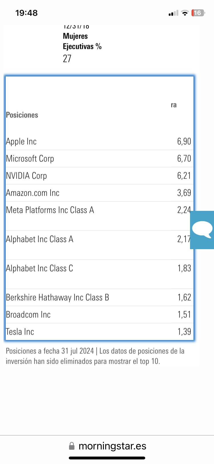 Y el peso de cada una de las grandes es aprox un 6%. A mi me parece caro yo creo que esta sobrevalorado por la IA pero antes fue el Metaverso y antes el blockchain y… luego sera… o no!! Veremos lo que pasa con la IA. Sigo pensando que aportan mucho valor en nuestro día día a miles de millones de personas.