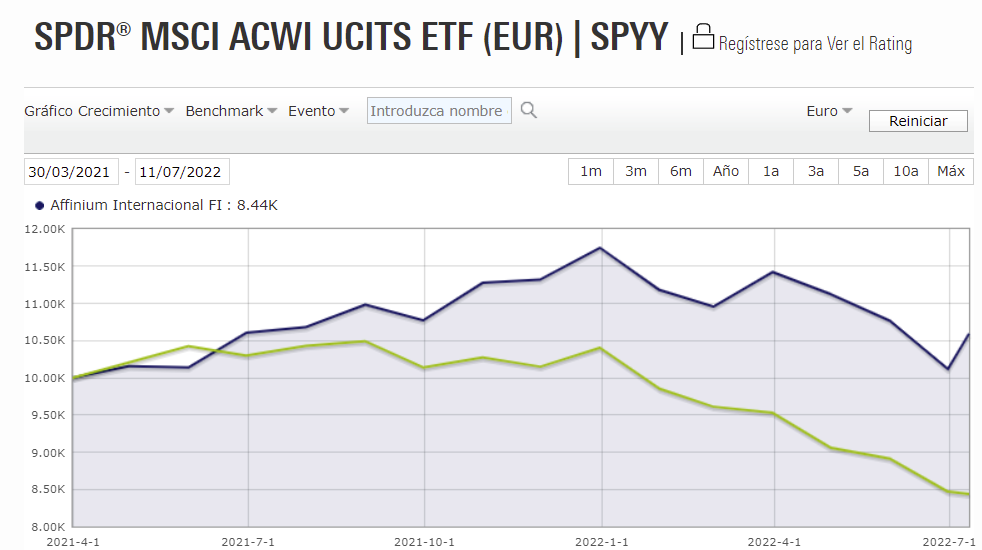 Pues me ha dado por comparar mi ACWI de confianza SPDR® MSCI ACWI UCITS ETF (EUR) con el fondo de Marcos, y por ahora lleva una buena ostia de -20% en comparación con la referencia!!!