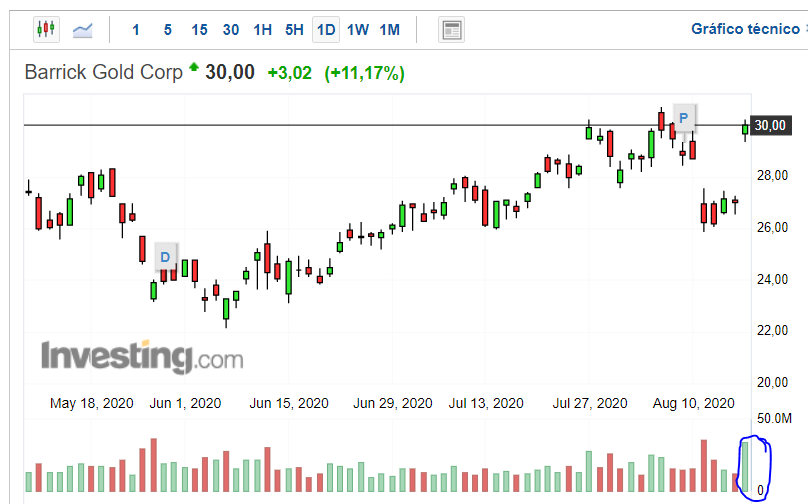 También es verdad que el oro está subiendo un 2%, pero otras mineras de oro no suben tanto como Barrick ni con tanto volumen.