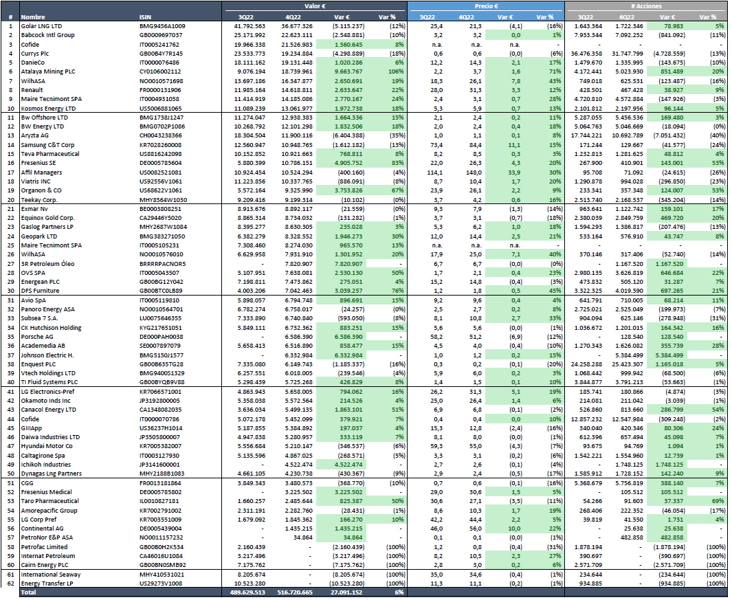 Es imperfecta por dos motivos. Por un lado, parte de las variaciones de dos fotos estáticas del fondo, así que no tiene en cuenta compras y ventas en el transcurso del trimestre. En segundo lugar, mi análisis trata de ser lo más automático posible, cogiendo datos de distintas fuentes, esto puede hacer que surjan errores a la hora de resumir la información.