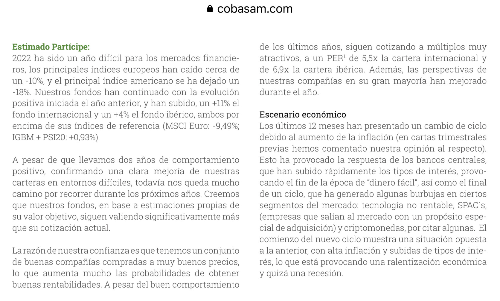 También creo que AzValor o Cobas, se suelen explayar más cuando sus fondos caen con fuerza que cuando suben. Aunque tal vez en el caso de Cobas, debería de andarse con cuidado que, llegado a cierto punto, haya inversores que se hayan cansado de las rentabilidades y terminen saliendo por algún comportamiento que consideren poco transparente. Cuando la rentabilidad acompaña poco, a largo plazo, hay quien termina acabando su paciencia por cualquier cosa.