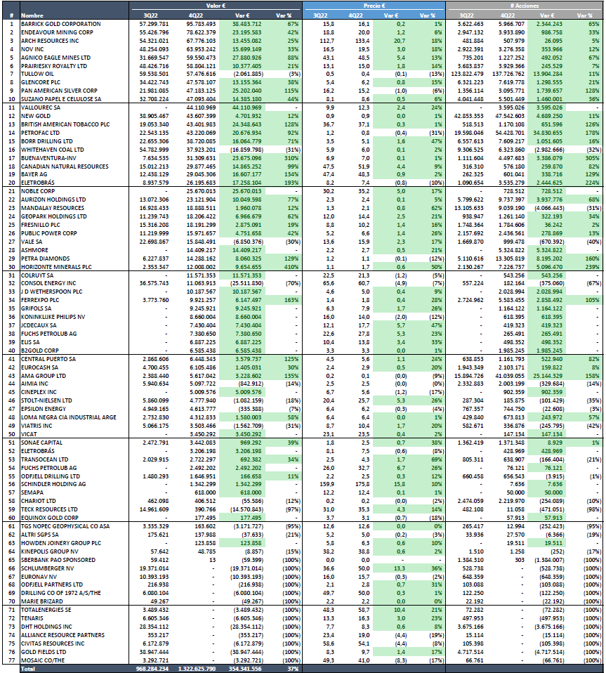Este análisis permite ver rápidamente que la fuerte subida de Barrick Gold en Azvalor se debe principalmente a la compra de títulos (con una cotización plana) mientras que en Arch Resources una parte importante del cambio viene por revalorización.