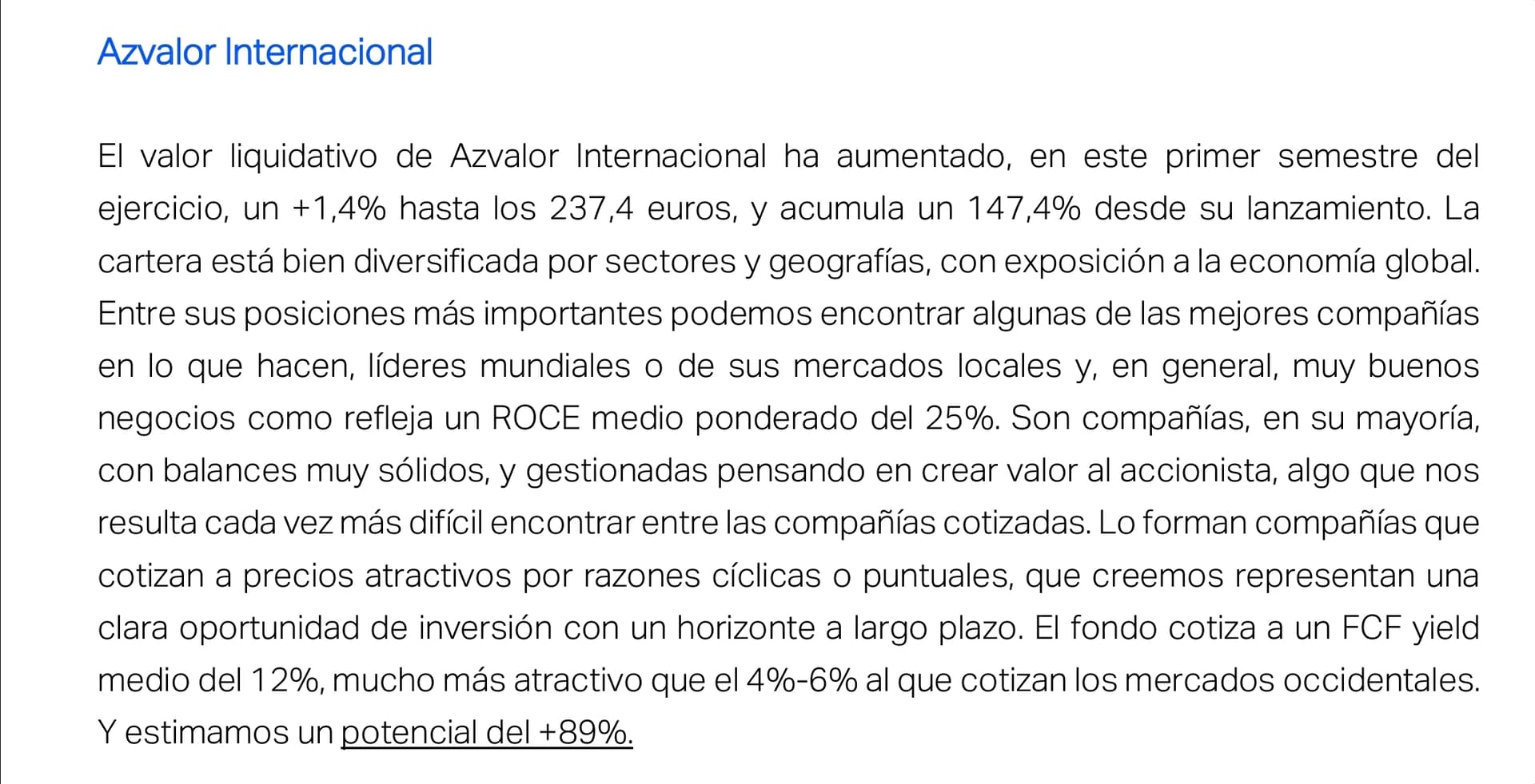Un poco sorprendido con el potencial de revalorización del que hablan. Más allá de lo subjetivo de dicho valor resulta cuando menos curioso que en unos meses en que el valor del fondo ha subido muy poquito y con algún que otro susto en los mercados no hayan sido capaces de aumentar ese supuesto potencial. Me parece raro, por no hablar de una comunicación muy deficiente en mi.opinión.