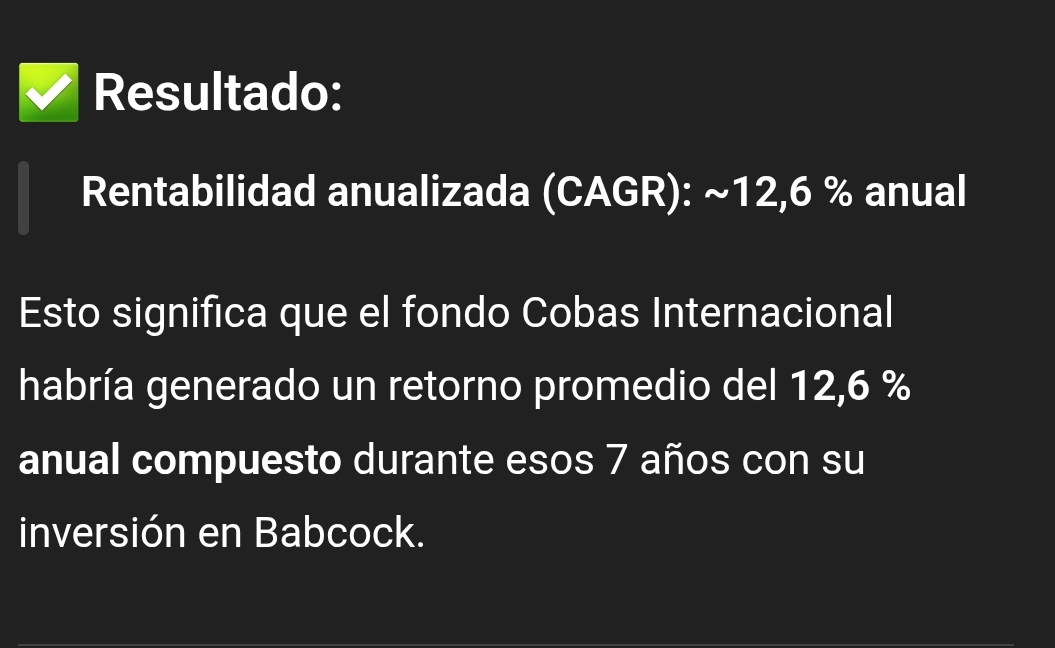 ¿De veras Cobas AM es tan modesta que se abstendría de hacer público el retorno aproximado de una inversión significativa de 8 años de duración, cuando al mismo tiempo publican un epígrafe exclusivo de varios párrafos sobre la inversión en Babcock en el que nos cuentan lo mucho que compran cuando cae y cómo venden cuando sube?