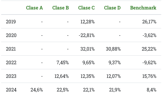 Merece mención también el Benchmark que utilizan, que creo es un índice de valores europeos. A pesar de que ellos invierten también en compañías americanas. Un mix de índices como benchmark sería más justo. Y no un índice europeo, que seguramente sale más de cara que ese mix.