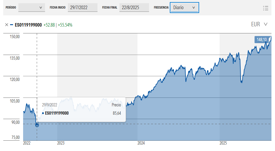 Buenos días. Salgo del turno y le leo. Compruebo mi inversión ya que no suelo comprobar ni comparar datos con la evolución del fondo (así soy de tranquilo). Inversión en CI Clase C el 10-01-2020, valor liquidativo fecha compra 81,12. En la actualidad, inversión en CI Clase B el 10-01-2025 por traspaso de clases, valor liquidativo fecha traspaso 151,44, total ganancia actual: 83,18%. En fin, yo no pido más, faltaría.