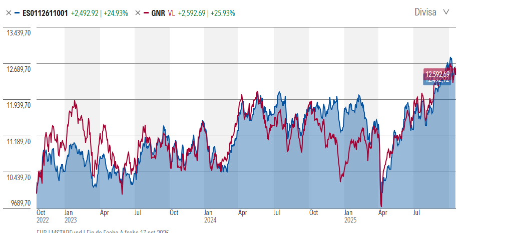 Si mira el siguiente gráfico verá que AzValor lo ha hecho los 2 últimos años de forma muy parecida a un ETF de un índice de recursos naturales que es, de hecho, su benchmark natural de hace mucho tiempo con la cartera que llevan.