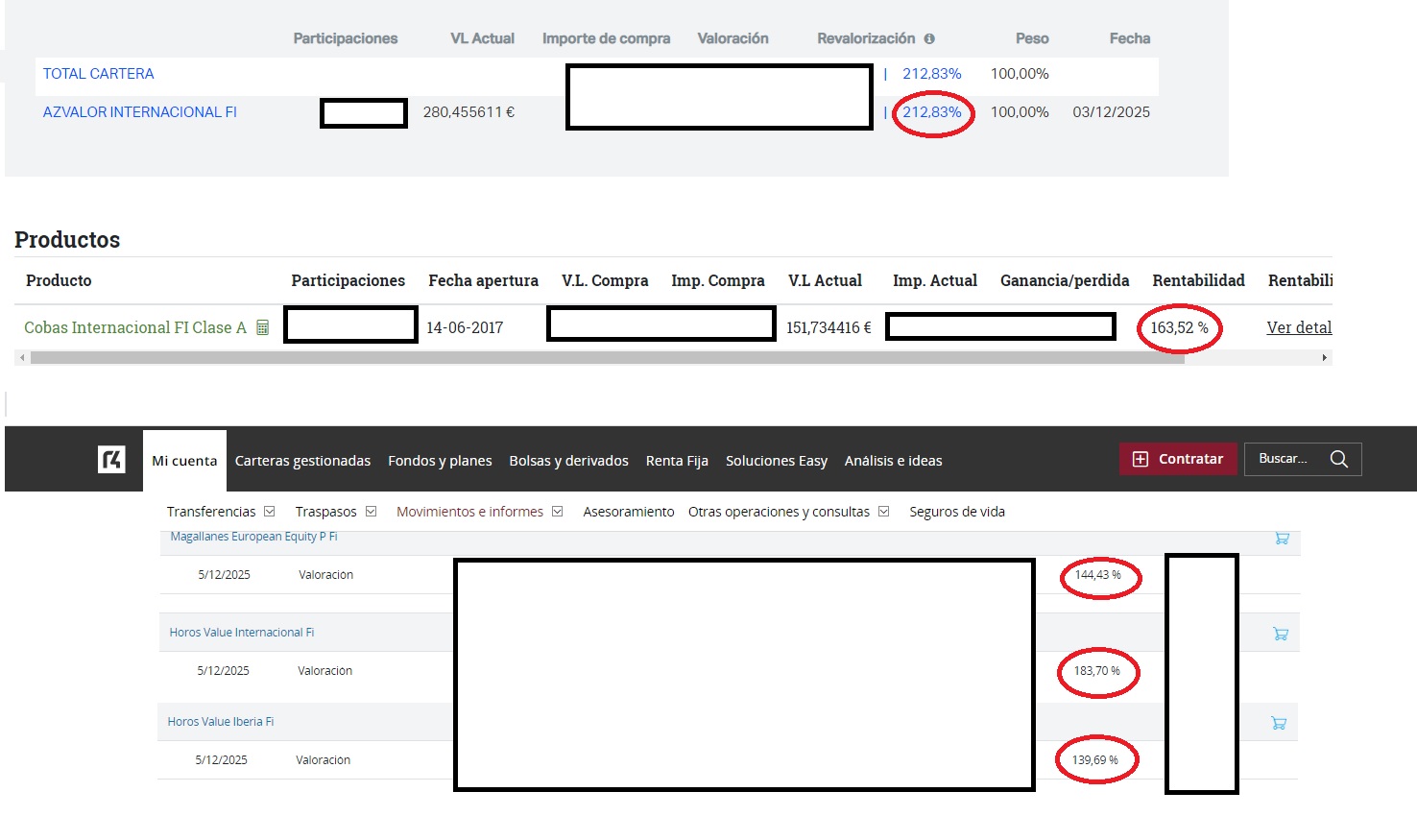Celebro se haya abierto a compartir sus posiciones en balue español con nosotros. Debo además decir que su market timing o sobreponderación en momentos bajos ha debido de ser muy acertada, por cuanto muestra vd retornos muy jugosos. Yo tengo posiciones en muchos de esos fondos y ni mucho menos tengo esos retornos. Si bien al Sigma y al Tercio más o menos he conseguido sacarles el retorno que arrojan, pues estoy con ellos prácticamente desde el principio, y en el Cobas GC tengo un 15% anualizado porque mis aportaciones fueron todas de golpe en 2021, en otros fondos, al haber hecho DCA, mi retorno es inferior al que arrojan ellos desde origen. Por ejemplo, el Magallanes European arroja algo más del 9% anualizado desde origen. Sin embargo yo no le saco más de un 5’7%, entiendo al haber ido aportando poco a poco. Tal es el caso con otros fondos también, a ver si puedo poner la tabla un día, cuando lo tenga todo bien calculado y revisado.