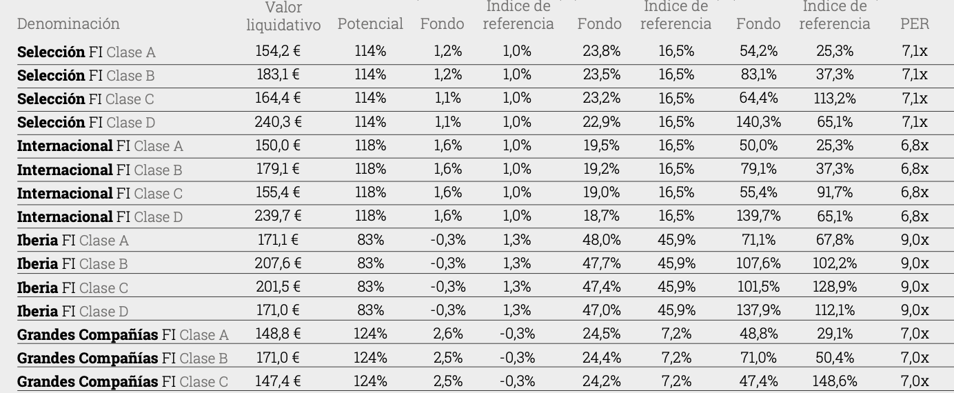 Por ejemplo: el Selección tiene según su último informe un PER de 7,1x. Que esa cartera se fuera a un PER de 15 supondría una revalorización de 111%. El potencial que le dan al fondo es de 114%.