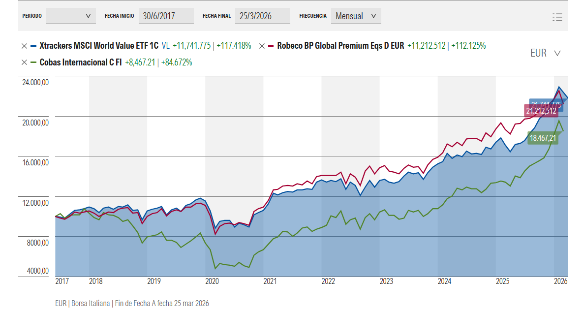 En la gráfica que pone veo un período inicial (3 a 4 años aproximadamente) en el que Robeco y Xtrackers ganan por goleada a Cobas y a partir de ahí (de estos 4 años) están casi empatados (en realidad gana el de Cobas