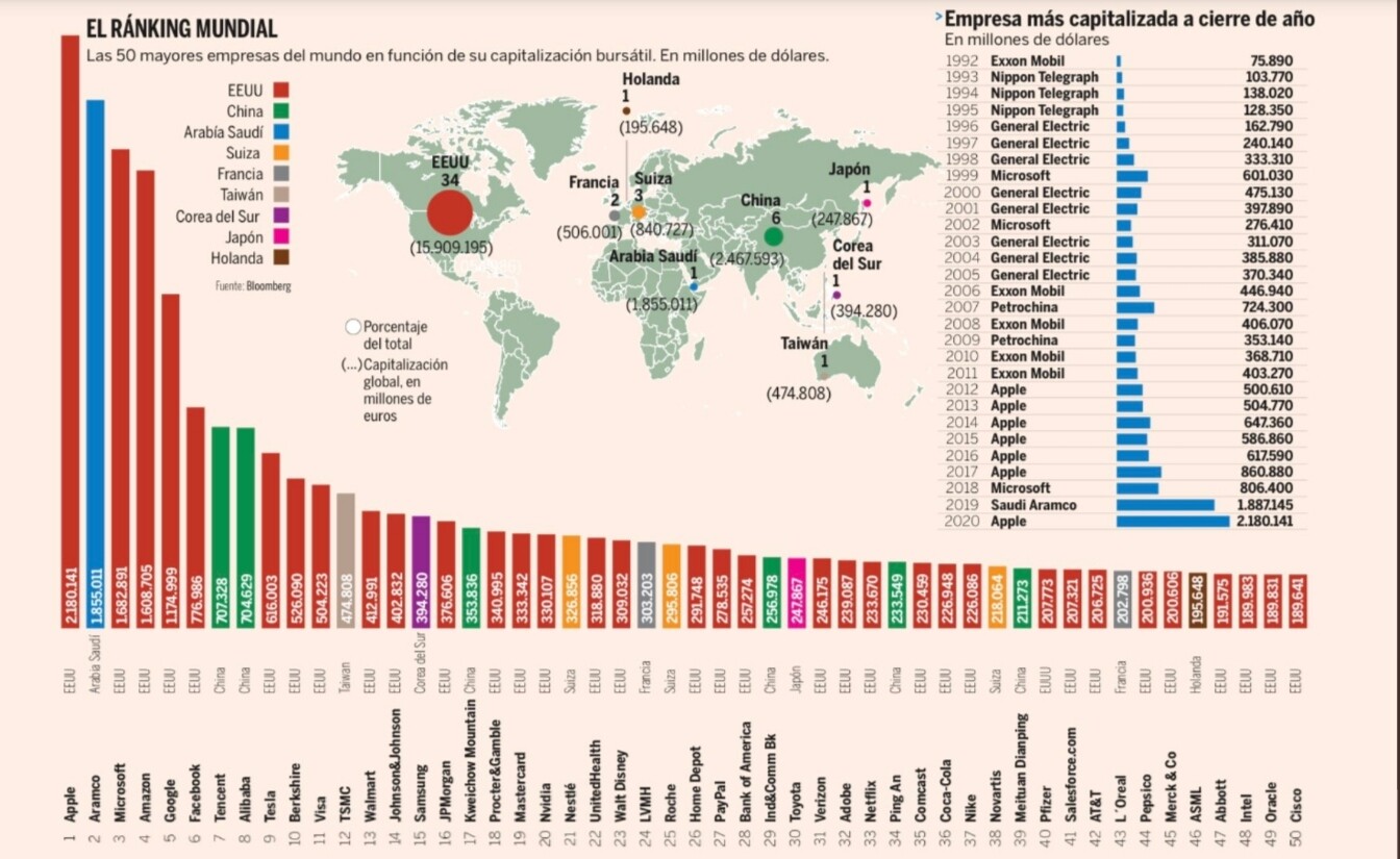 Sub-ranking europeo(solo 6 en el top 50), Nestle, LVMH, Roche, Novartis, l’Oreal y ASML por este orden, ninguna en el top es Alemana, Britanica, Italiana o Española.