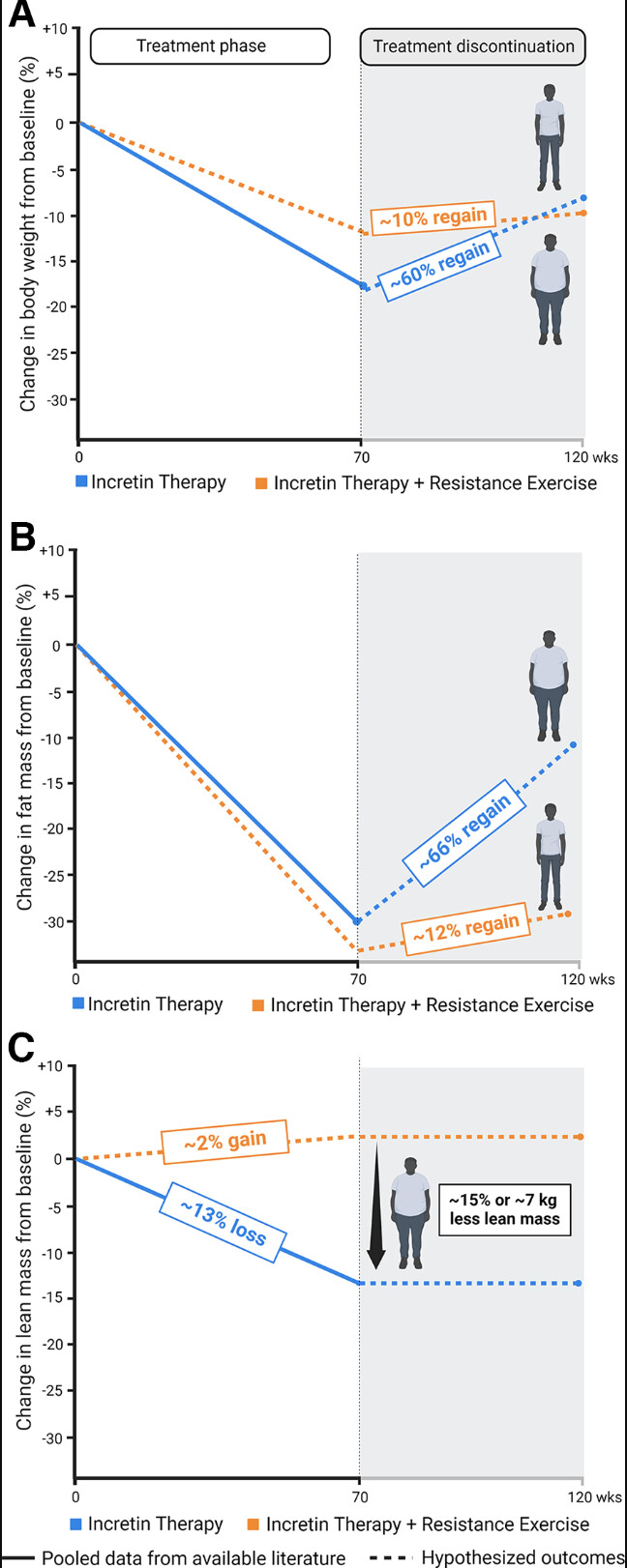 Sin embargo, el problema sigue siendo el mismo. Si el paciente no pone de su parte, lo único que se consigue es que las pérdidas de peso provengan de todas partes, incluyendo el tejido adiposo, así como la masa muscular y la ósea. Cuando menciono que el paciente debe poner de su parte, me refiero a que debe comenzar a hacer ejercicio y a alimentarse de manera razonablemente adecuada. Esto puede convertirse en un problema grave a medio y largo plazo, ya que puede derivar en osteoporosis (con riesgo de caídas, fracturas de cadera, y mortalidad) y acentuar la diabetes tipo 2 y la sarcopenia (no debemos olvidar que el músculo esquelético es el órgano por excelencia en el consumo de glucosa).