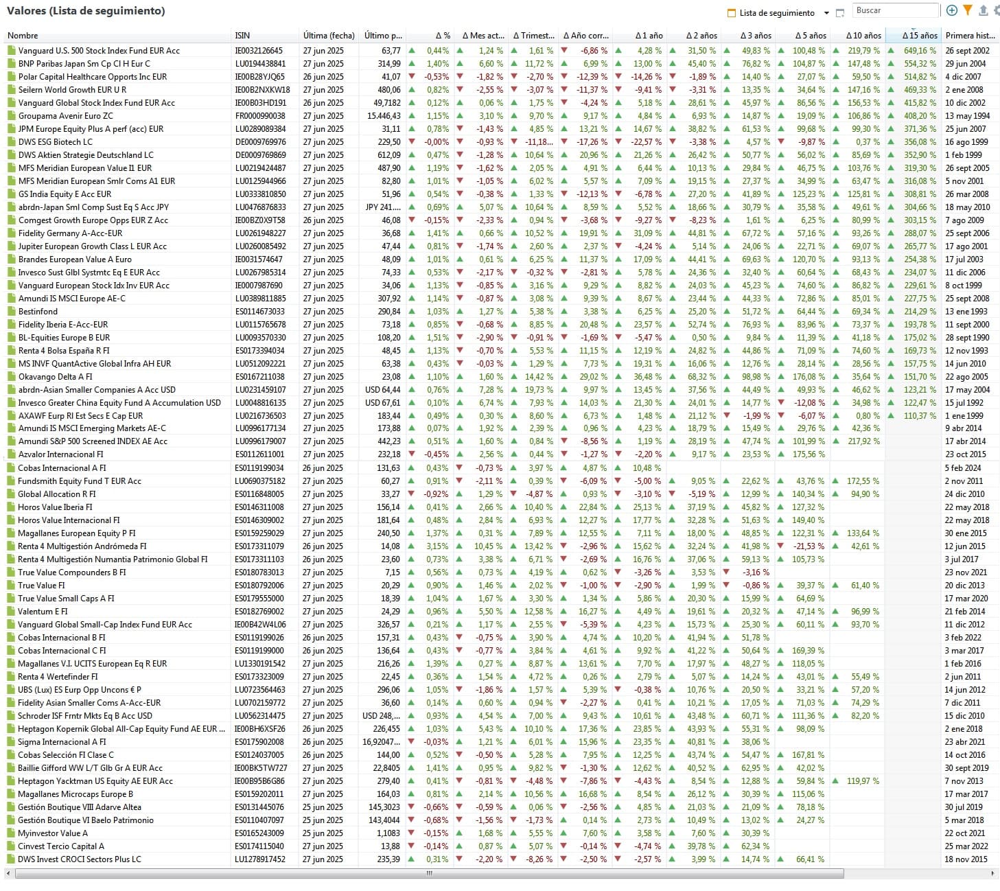 Le felicito por mirar un plazo que casi nadie mira, aunque es igual de aleatorio que cualquier otro y supongo que muchos no lleva de los de arriba al menos desde entonces, sabiendo que Vanguard, etc… aún no se distribuían por aquí. Si le interesa mirar desde 2007 o cualquier otro plazo (desde antes o después de las .puntocom, desde antes como le dije o después de la crisis financiera de 2008, etc…) igual se lo puedo mirar, aunque supongo ya serían menos, salvo que tenga alguna petición concreta de un par que quiera comparar a algún plazo (ya que como ve son más algunos de mi lista de seguimiento que un screener cuantitaivo de todos los FI)-