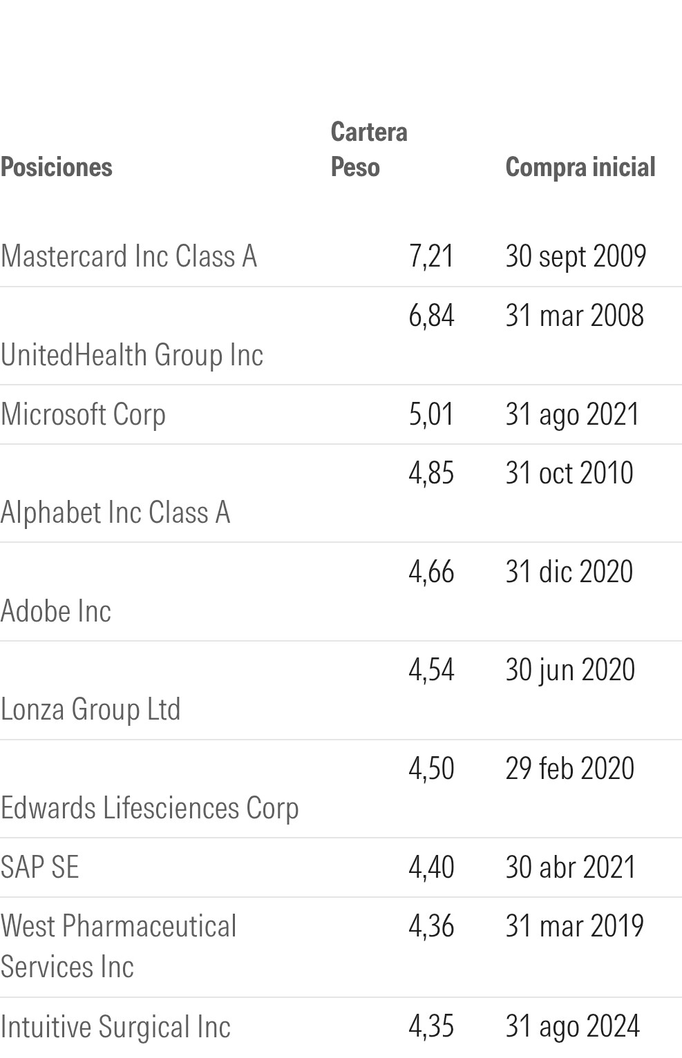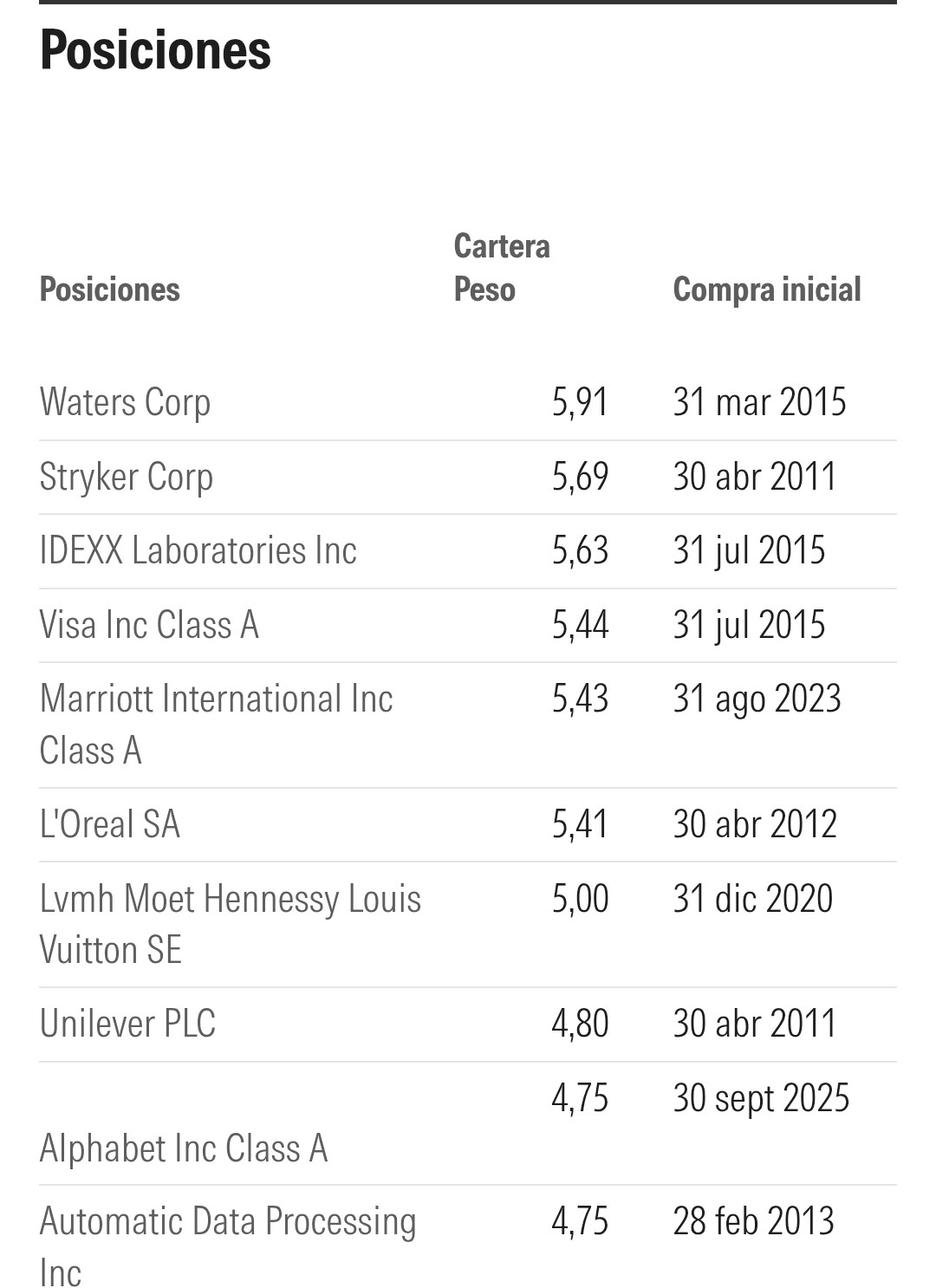 Fundsmith Equity Fund T EUR Acc *** ISIN LU0690375182 cae un –12,5 % desde principio de 2025 con esta cartera:
