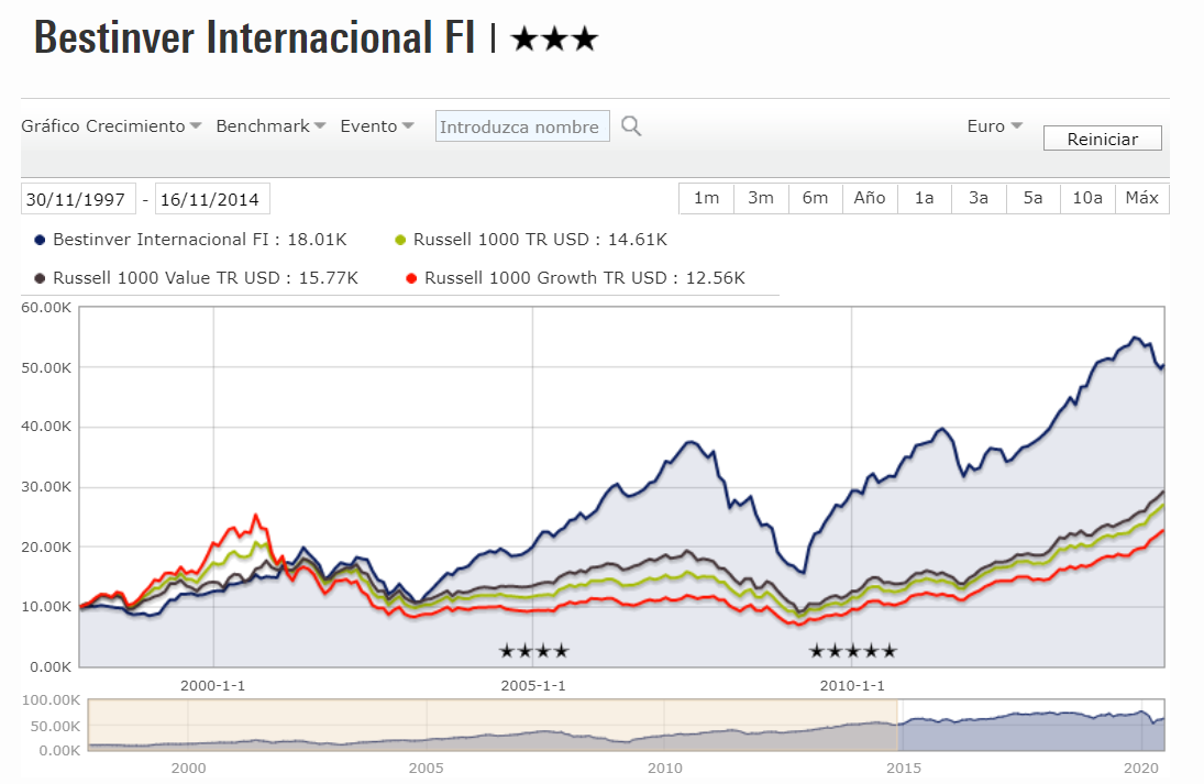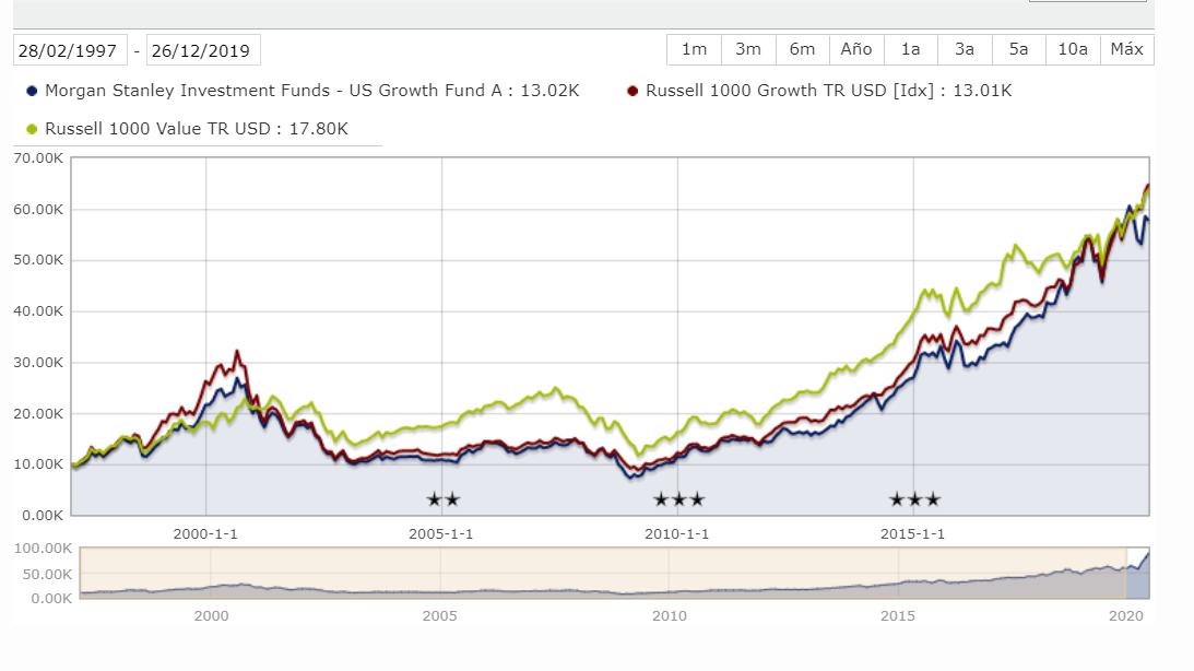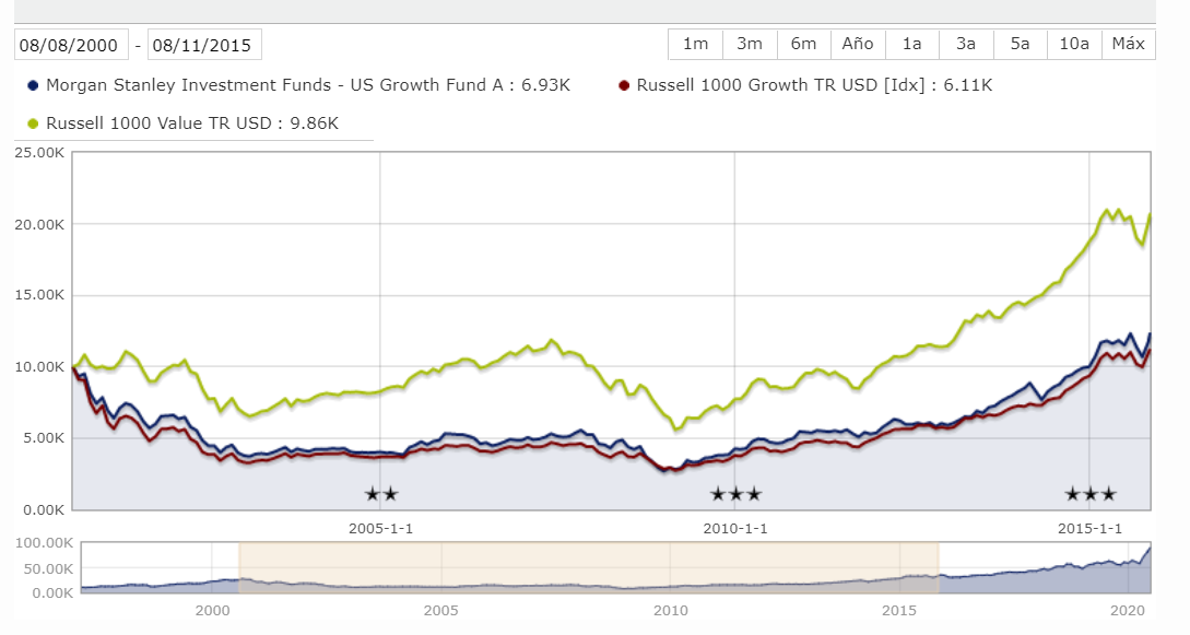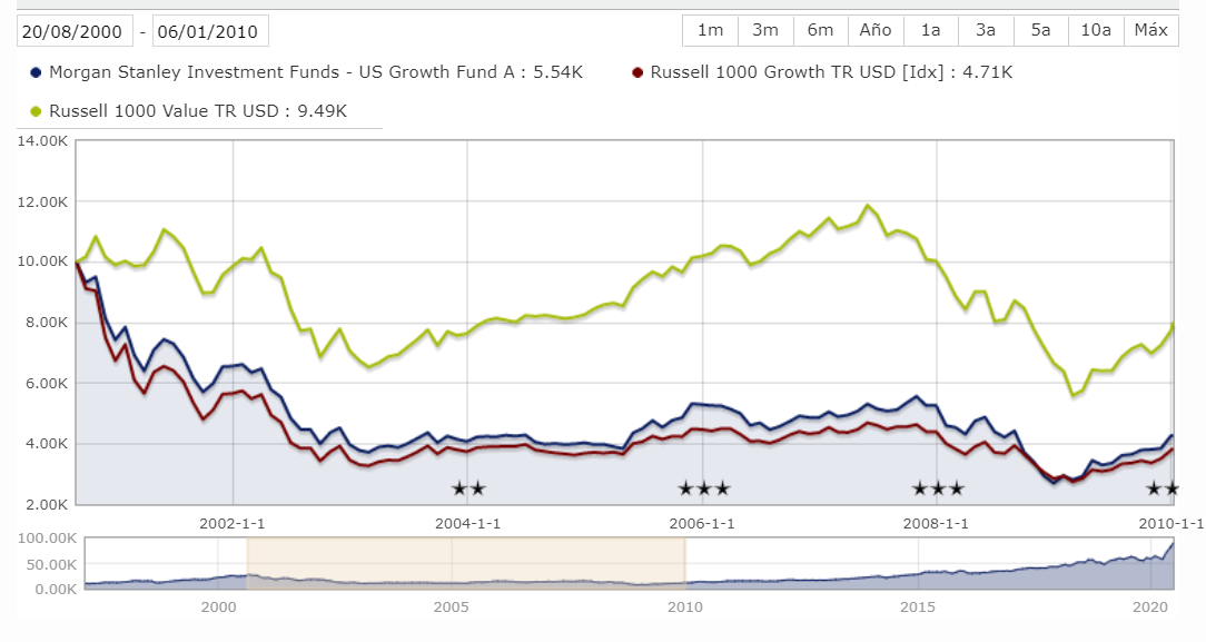 Vamos a coger el fondo Ms invf Us growth, el más rentable de todos, quality growth, proceso impecable, equipo potente y vemos esta imagen dantesca para cualquier inversor que haya estado invertido en el fondo desde su inicio hasta el 2.010: