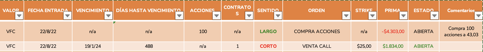 Ejecución de la estrategia el 22 de agosto. Compro 100 acciones de VFC a 43,03 y simultáneamente vendo la call strike 25 con vencimiento 19/01/24 y me pagan una prima de 1.834€.
