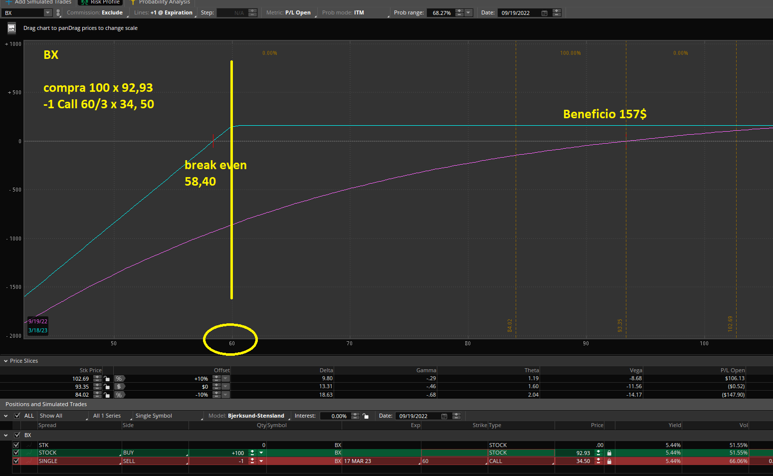 Esto significa que tengo beneficio de 157$ (1,7%) + dividendos (5,5%), simplemente si BX cotiza en Marzo por encima de 60$.