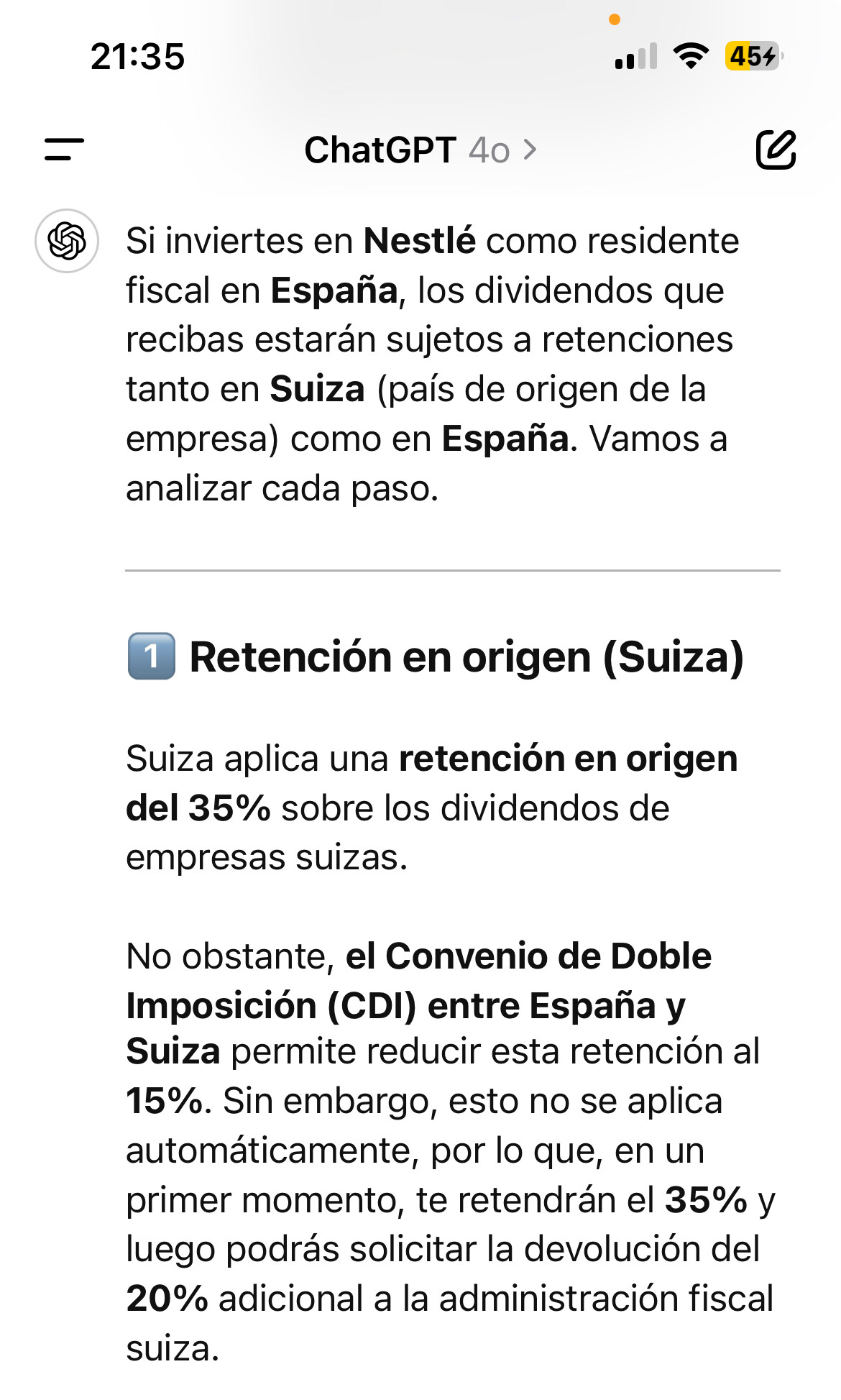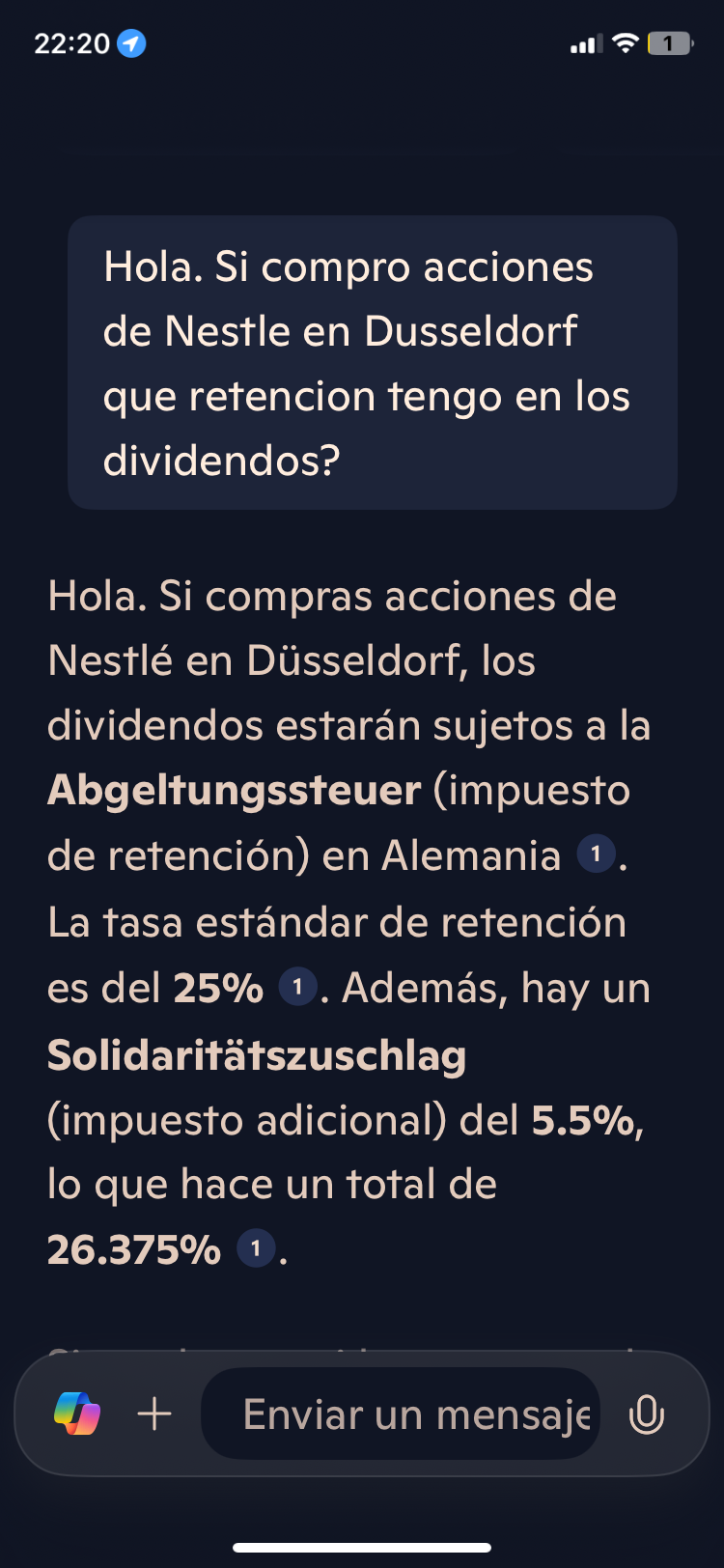 Tengo una duda señores. Nestle cotiza en suiza pero también en Dusseldorf y en otros lugares. En el caso de comprarla en Alemania, allí la retención es mas baja, del 25%, y además se puede reclamar la diferencia en las haciendas correspondientes ¿Que porcentaje de retención aplican en este caso?, entiendo que la Alemana.