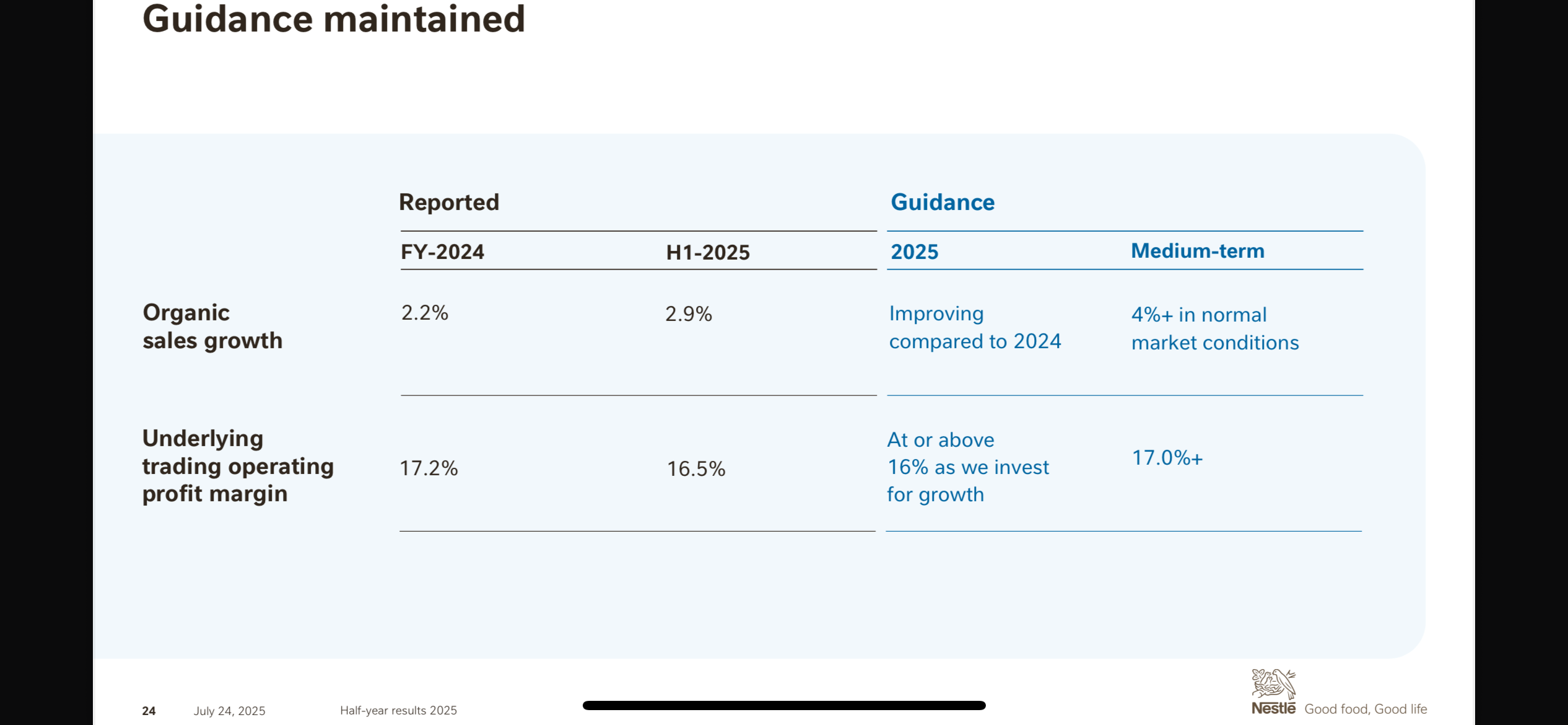 Philipp Navratil, Nestlé CEO commented: “I am encouraged by our performance during 2025, which reflects the targeted actions we have taken in a difficult external environment. Real internal growth (RIG) was positive across all Zones and global businesses. We increased our investment in marketing, delivered a UTOP margin of 16.1% and generated CHF 9.2 billion in free cash flow. Improving organic growth, RIG and market share trends in the second half show that our actions are working.