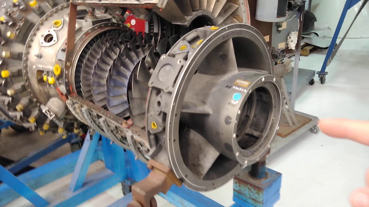 En la foto vemos la carcasa abierta y en su interior 6 etapas de vanos estáticos de un compresor axial. Se ve también el espacio entre cada etapa de vanos que una vez montado el conjunto ocuparán los álabes.