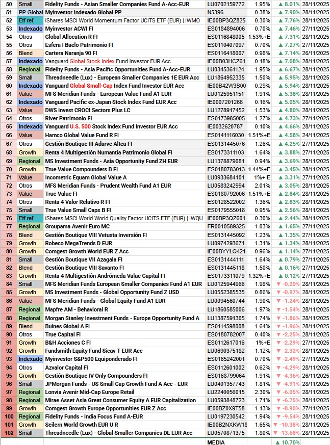 Yo de estas listas, siempre miro los fondos que están mas abajo ja ja. Reviso su histórico, y si el escenario futuro puede ser propicio. A las Small Caps Growth, las bajadas de tipos les debería favorecer, aunque hay que asumir su alta volatilidad, y correlación con los mercados principales (SP500…), por lo que si hay una " corrección", lo notaran aún más que las “Big Caps”.