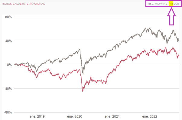 En principio el índice que se usa es el MSCI ACWI Net Total Return EUR Index. Es decir, estamos de acuerdo con tu razonamiento y precisamente por eso utilizamos el que en realidad sugieres. No sé si no has visto el NET que hay delante de TR jeje