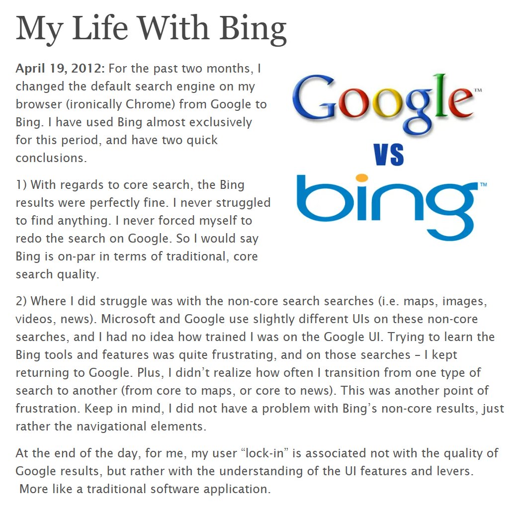 Sería interesante saber si Bing ha ido copiando las reglas de posicionamiento de Google. Caso contrario también sería una barrera de salida importante para los generadores de contenido (y sus proveedores de servicios de marketing online) el cambiar toda la estrategia.