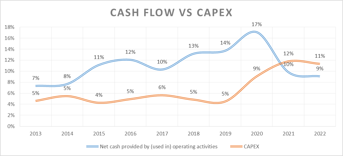 Muestro flujo de caja operativo sobre ventas y CapEx sobre ventas: