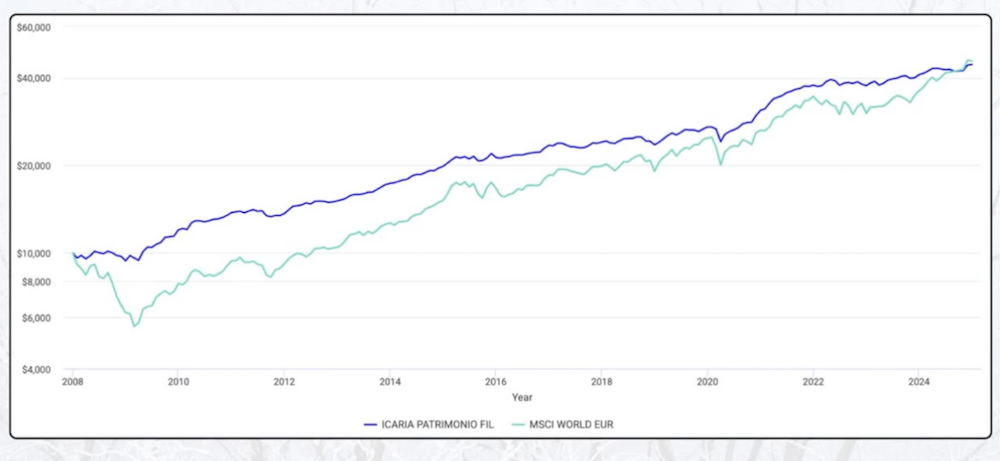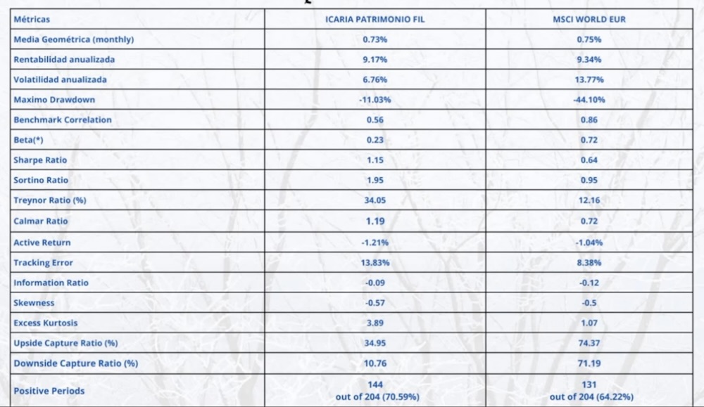 El primero, I. Patrimonio, no tiene nada que ver, pero nada, nada. Se centra en una estrategia endowment. Es un “fondo de fondos”. Ni siquiera gestiona los fondos el propio gestor. Es una “cartera completa” dentro de un FIL, que incluye Private Equity, Deuda Privada, Real Assets o Hedge-Funds con beta negativa/condicional. Delega la gestión en más de 20 gestoras de primer nivel mundial, con rentabilidades auditadas durante décadas, batiendo a los benchmark de referencia. Busca maximizar el Ratio Sharpe. Eso sí, con liquidez trimestral y un mínimo de inversión de 100k. Aún con esa prima por iliquidez, no he visto nada igual, en sus respectivas categorías cotizadas. Vemos algunos fondos con retornos de high yield y con volatilidades de monetario, vemos otros batiendo a los índices durante 20 años, o incluso los más espectaculares los vemos subiendo fuertemente cuando RV se hunde un 50% y tienen un 90% de años positivos en lo que llevamos de siglo… todo ello lo consigue con un asset allocation que da como resultado la mitad de la volatilidad del MSCI World y un tercio de su drawdown histórico.