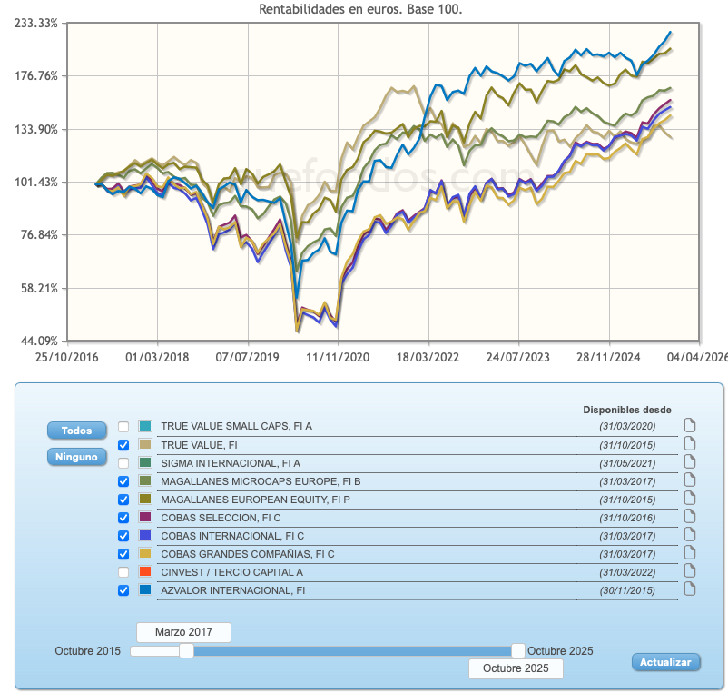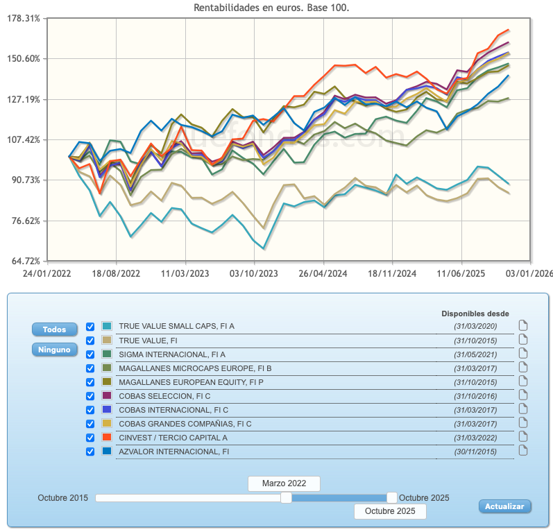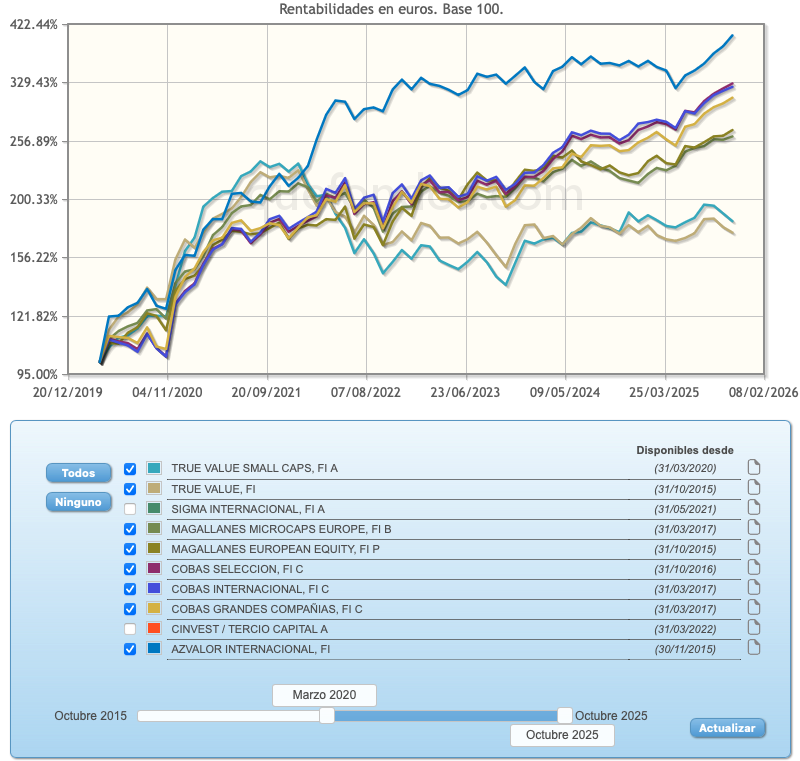 Este gráfico lo tenemos más interiorizado todos. Con AzValor Internacional a la cabeza, seguida su estela por el Magallanes European, y luego un grupo más o menos heterogéneo que lidera el Microcaps y lo cierra el True Value.