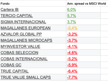Mucha disparidad entre fondos también al medirlos en diferencial frente a un mismo benchmark.