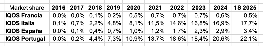 En este sentido si la memoria no me falla, comentaron en una ocasión que a partir de un 2-3 % de cuota de mercado de IQOS en un país, este ya seguía creciendo por boca a boca. Habría que verlo en la práctica, anda en un 3.4 % de cuota, pero bien no le sentaría a su crecimiento claro (últimamente están dándolo todo por eso, por si luego se les cierra esa ventana).