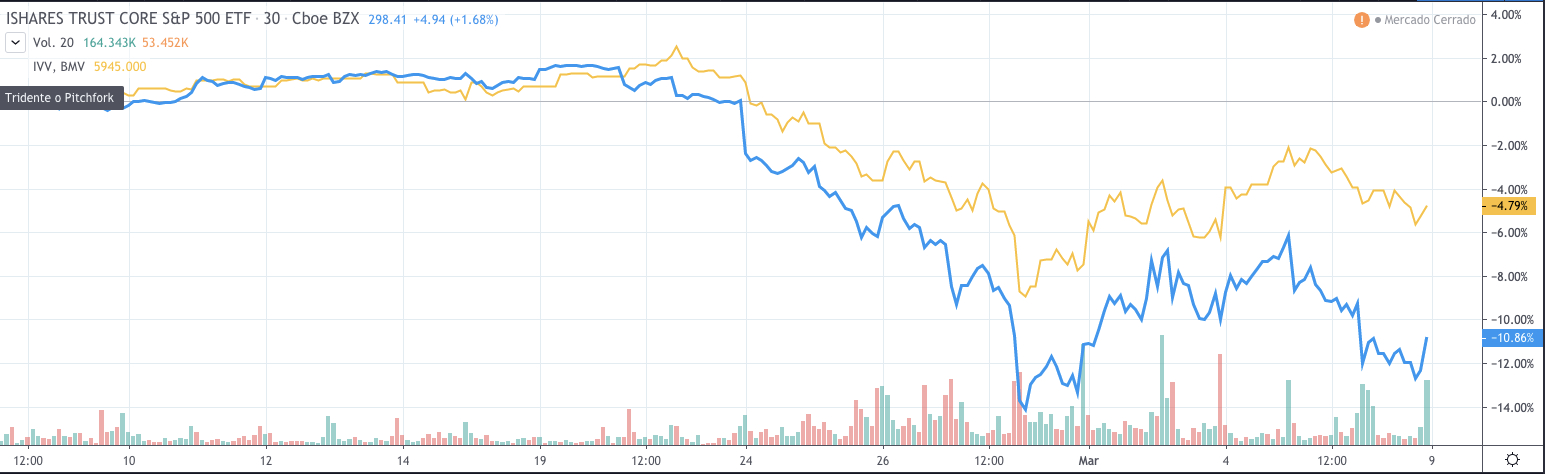 Les dejo una comparativa a un mes del IVV en ARCA (azul) y el IVV cotizado en México (amarillo).