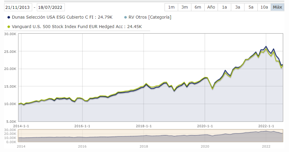 - El fondo de Dunas adopta criterios ESG siguiendo el índice S&P 500 ESG Total Return Euro Hedged mientras que el Vanguard no. Sólo con eso ya no son comparables. Si quiere puede realizar comparaciones con Amundis que tiene fondos UCITS ESG o iShares que los tiene en formato ETF que recuerde.