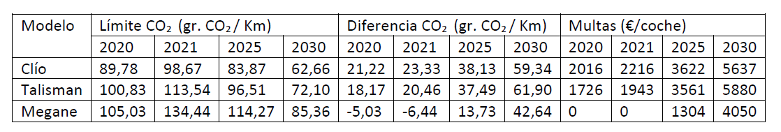Así, aplicando las fórmulas de la tabla anterior de acuerdo con los valores de emisiones según las normas NEDC y WLTP, tendremos los límites establecidos por años, la diferencia con los mismos y las correspondientes multas a aplicar. Recuerden que los valores de CO2 se referencian a la norma NEDC en el año 2020 y a la norma WLTP a partir del año 2021
