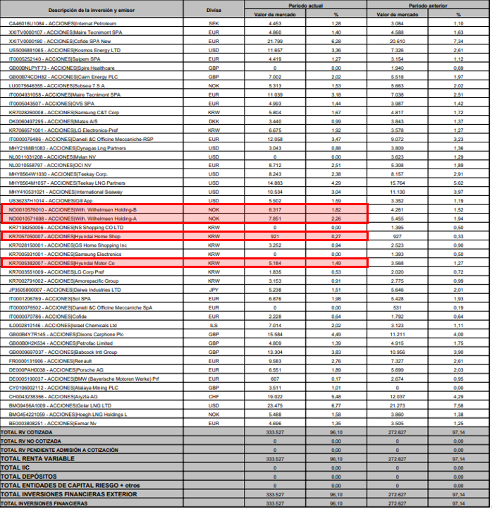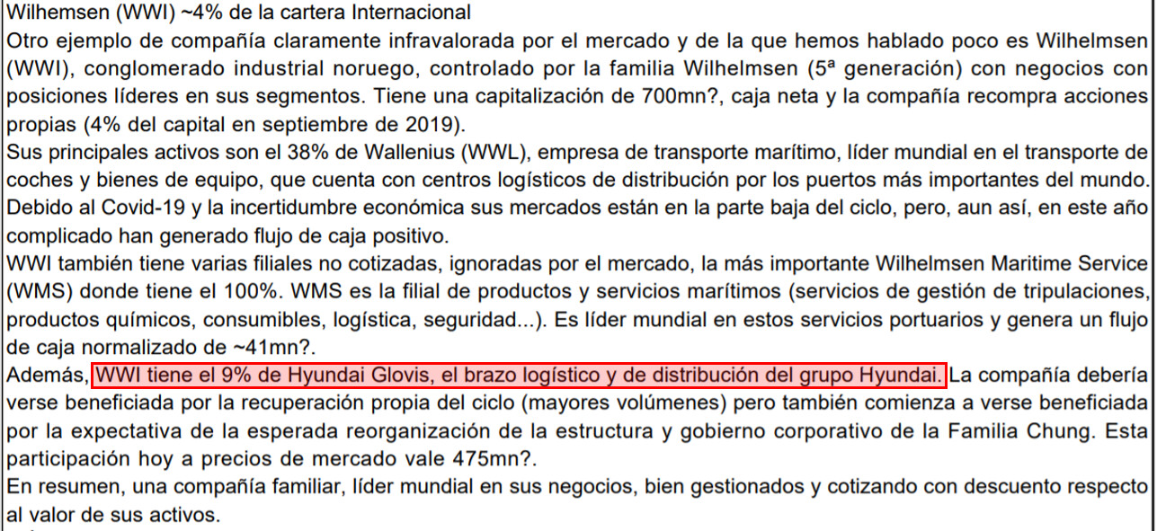 Parece que Cobas Internacional FI tenía, a 31 de diciembre de 2020, un 1,45% en Hyundai Motor Co, un 0,27% en Hyundai Home Shop y un 4,08% en Wilh. Wilhemsen Holding, un conglomerado industrial noruego que entre otros activos, según dicen en el propio informe semestral del fondo, es propietario del «9% de Hyundai Golvis, el brazo logístico y de distribución del grupo Hyundai» (lo que no he calculado es en qué % de Hyundai Golvis en cartera del fondo se traduce esta posición).