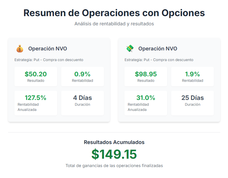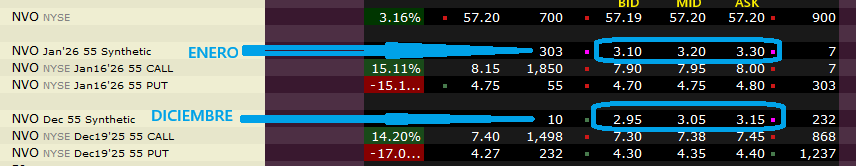 Comprando esta posición sintética nos aseguramos el derecho de tener 100 acciones de NVO en cartera a vencimiento a un precio de 55 $ (strike).