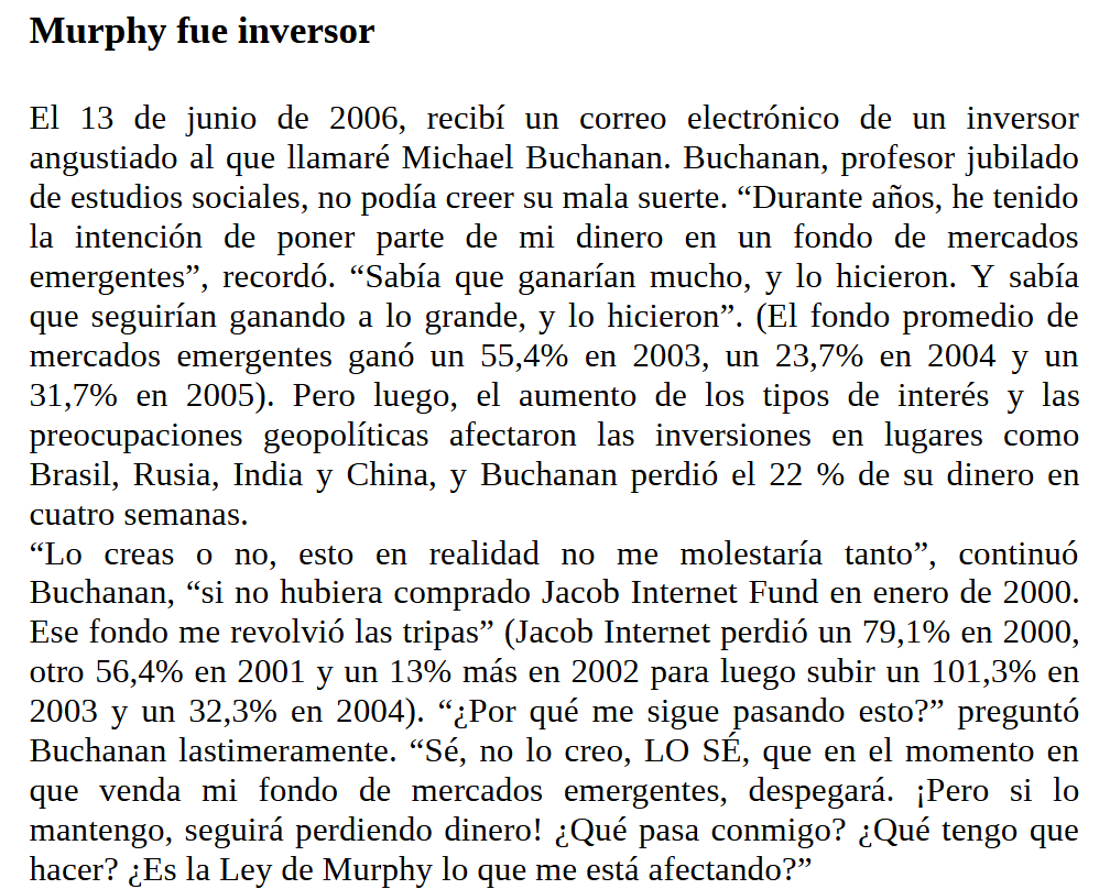 Esto me ha recordado a una parte del libro “Tu dinero y tu cerebro” de Jason Zweig. La “ley de Murphy”