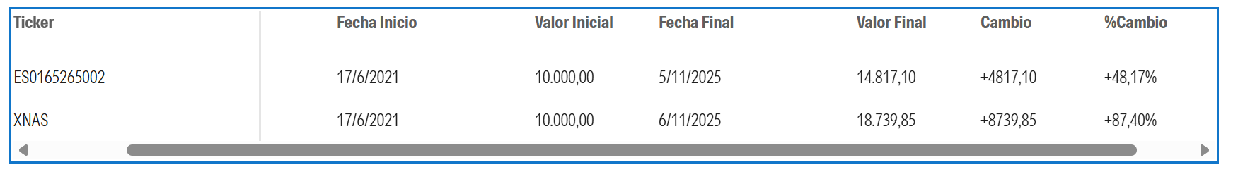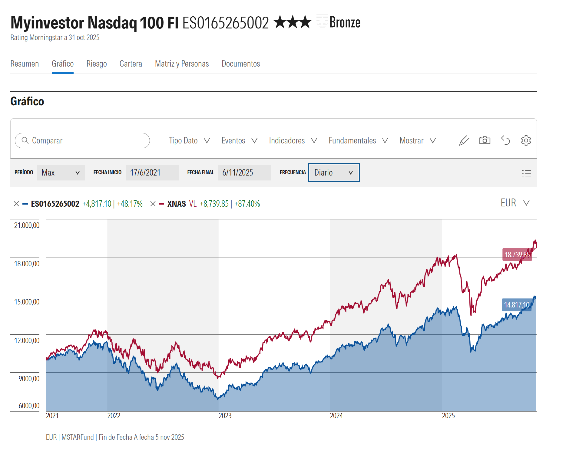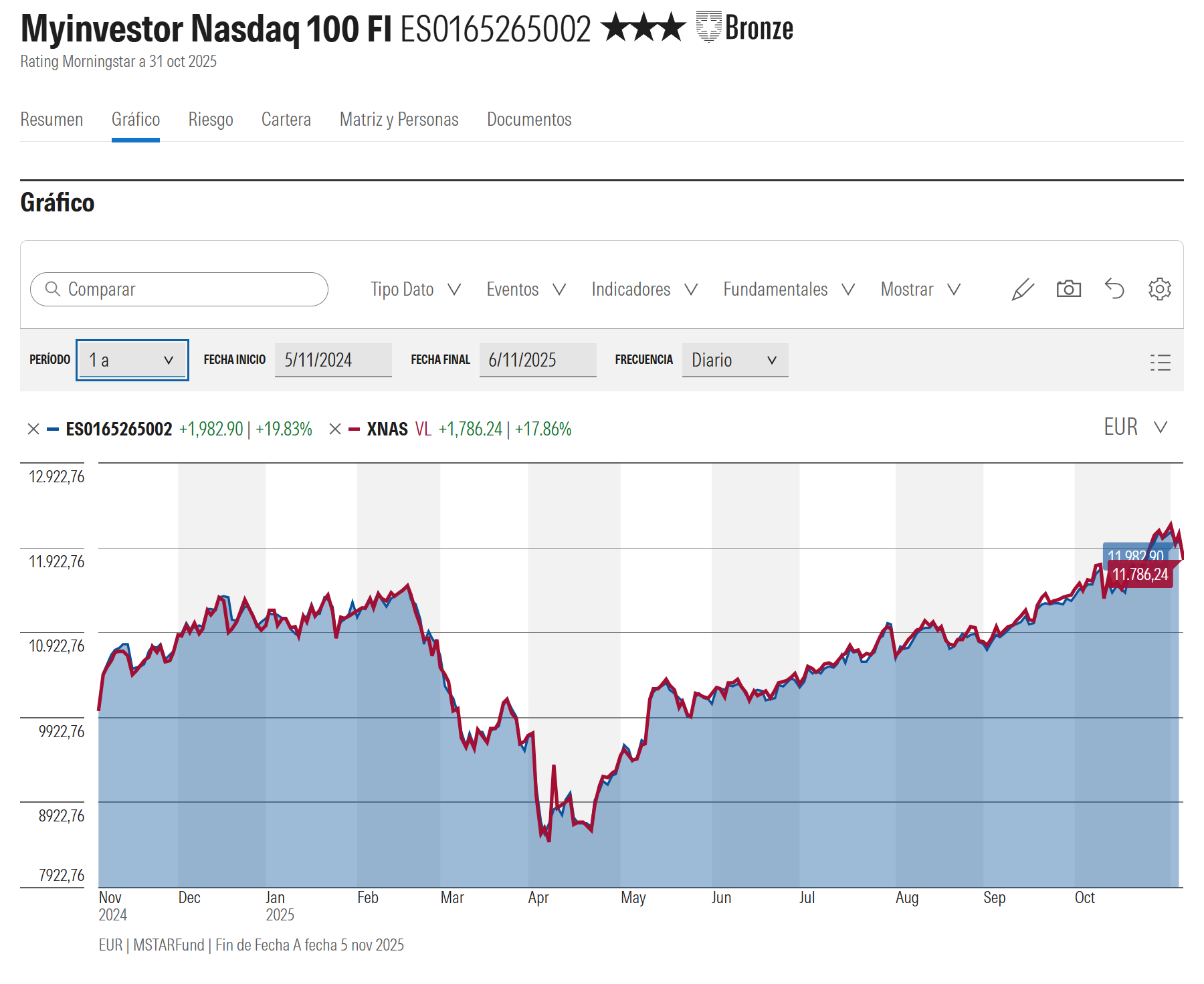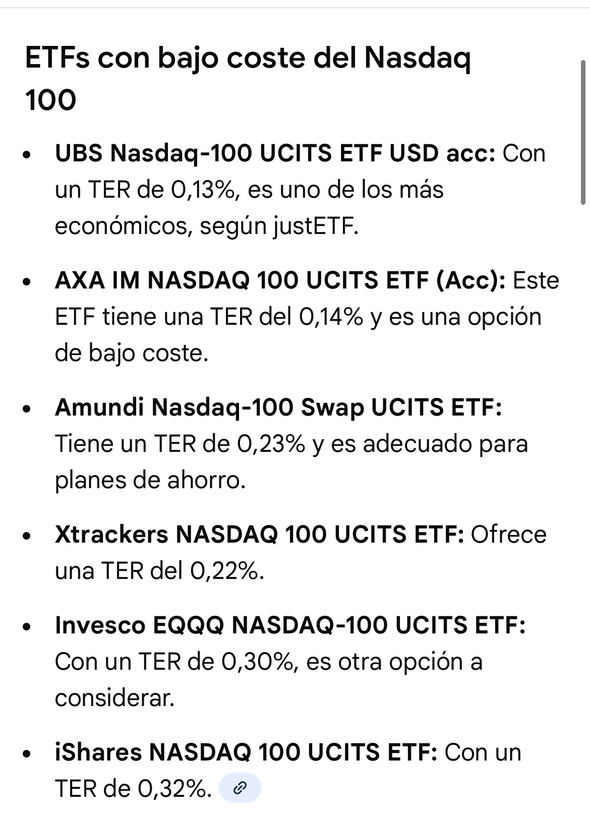 Igual me olvido alguna, en resumen, va a morningstar o alguna herramienta, le pone el índice sin comisiones como referencia y va agregando los ETFs del nasdaq con mayor AUM y compara los rendimientos y la correlación entre picos y valles, ahí verá “desacoples” mayores o menores según el ETF, tanto en rendimiento como en replicar el índice y se va depurando luego el resto de variables, como mínimo que siga decentemente al índice, el fondo de MyInvestor tuvo épocas terribles con pérdidas grandes sobre un ETF típico.