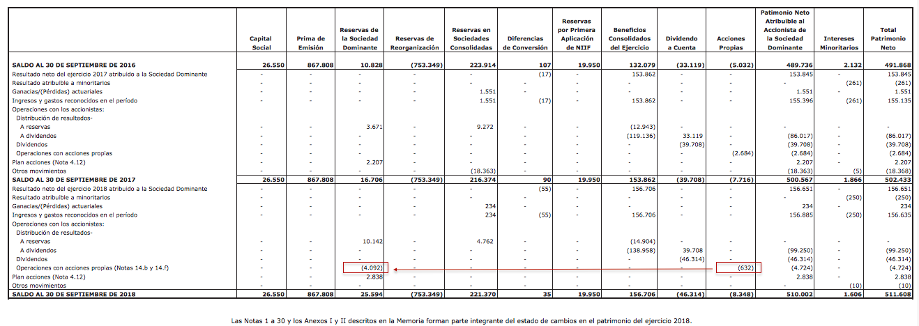 En 2018 Logista informa que liquida el primer bloque del plan de incentivos 2014 para determinados empleados, y lo liquida con acciones de autocartera. Según la memoria la diferencia de -632 en acciones propias que aparece en el ECPN corresponde a la entrega de 2.733 miles de euros (2.705+28) en acciones propias a los beneficiarios del plan, menos la recompra de acciones propias que hace durante ese año por importe de 3.366 miles de euros para ir haciendo autocartera. Hasta aquí todo bien, 2.733 - 3.366 = -633.