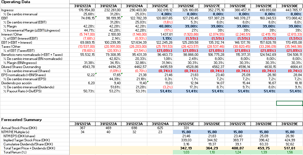 Viendo que Novo Nordisk no para de caer, he cogido una humilde tabla para ver qué pasa a 5 años si este año crece un 4 % y luego se estabiliza al 8 % hasta 2.029 (teniendo en cuenta que la tasa de crecimiento media de las ventas desde 2.005 ha superado el 12 %) y bajando los márgenes EBIT del 42 % actual al 39 %.