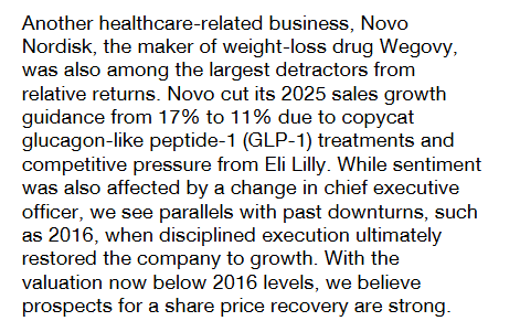 Teniendo en cuenta esto sale una rentabilidad no despreciable. ¿qué opinan que descuenta el mercado para tumbarla de tal forma? En mi opinión ha sido la revisión a la baja del crecimiento esperado, el impacto mediático por posible bajada de precios en EE.UU., el contratiempo con la FDA en la planta de Catalent y la competencia de Eli Lilly (que tiene mucho más apalancado el balance), no obstante no creo que hablemos de un mercado donde el ganador se lo lleve todo. Tampoco se espera impacto por aranceles y del precio al que se vende ozempyc, etc. hay mucha parte que no va a Novo Nordisk, con lo cual el impacto no sería tan bestia como se piensa en un principio.