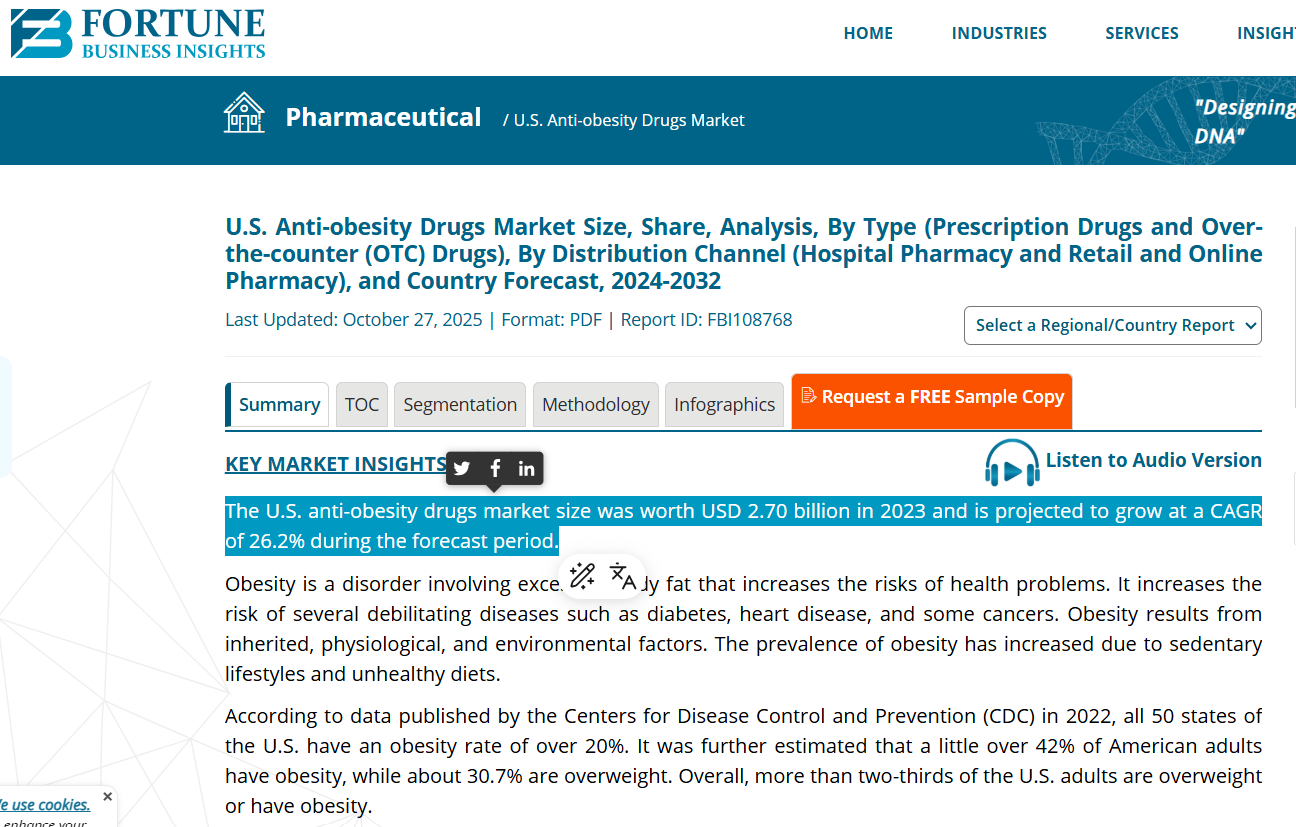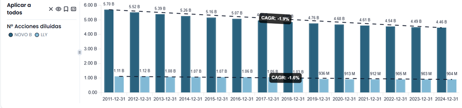 Ahora mismo, hay dos empresas punteras en obesidad, Novo Nordisk y Eli Lilly y haciendo unas cuentas básicas: