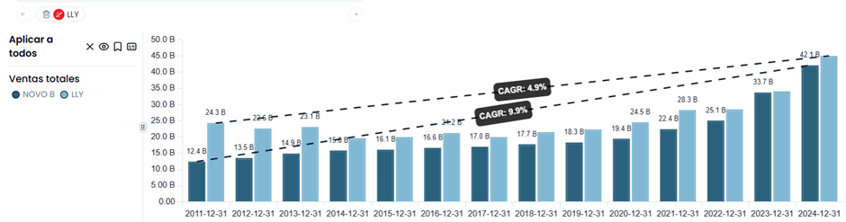 Desde 2.011, Eli lilly duplican ventas mientas que Novo casi cuadruplica, siendo el crecimiento de Novo más estable e igual de explosivo en los últimos años: