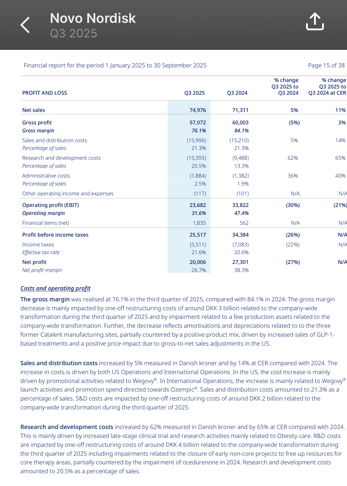 Eli lilly sistemáticamente ha invertido más en I+D+i que Novo, y esta otra más en gastos generales etc. Con la que se viene encima Novo aumentará esta partida afectando al márgen operativo, si bien, a su vez ha reducido personal lo cual supondrá mayor capacidad de I+D+i sin afectar al margen a priori.