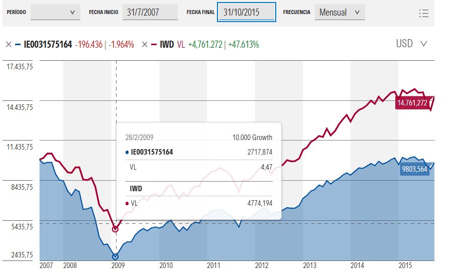 Aquí tenemos el gráfico comparando el fondo en la clase A en USD respecto al ETF ishares del Russell 1000 Value en USD también. Vemos que desde la mitad de 2007 mientras el ETF cayó alrededor de un 53% , el fondo llegaba a caer alrededor de un 73%. Con tanto diferencial negativo normal que ya luego se haya quedado lejos del dicho índice o ETF.