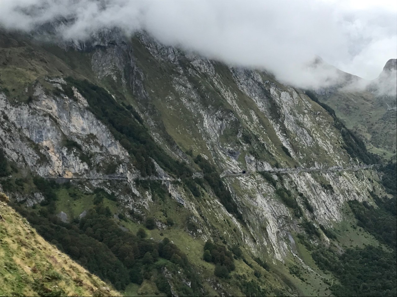 La carretera, delicada pero perfectamente transitable, sigue un barranco abrumador, lo que sin duda más me llenó de la ruta, no sé, me sentí lleno, suene cursi o no. y eso que sufro de un ligero vértigo. Abrumador. Un risco de un montañon que cae en picado, frente a un valle cerrado por otros picos de igual calado. El fondo verde, muy verde, que se aclara con la altura. He visto otros, pero con las oportunidades que te da la moto para disfrutarlos pues no, yo lo encontré espectacular. El resto de ruta estuvo a la altura, esto de los Pirineos se las trae, no pensaba que la joya pesara tantos quilates, por lo visto y por lo mucho que queda por ver. No me importa esperar así el asalto a los Alpes, si los dioses me siguen favoreciendo, veremos en el 2021.