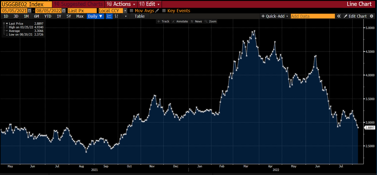 Sabíamos que íbamos a tocar techo en algún momento. Una moderación de la tasa no significa que no podamos tener inflaciones del 5% de media en los próximos años, lo cual también puede hacer pupa. Si bien la inflación esperada por el mercado a uno o varios años vista, ya sea estimada por la Fed, cotizada en los swaps de inflación y demás, vuelve a un cauce bastante más bajo. Es decir, la creencia más extendida ahora mismo es que habrá desinflación a costa de pasar por una recesión.